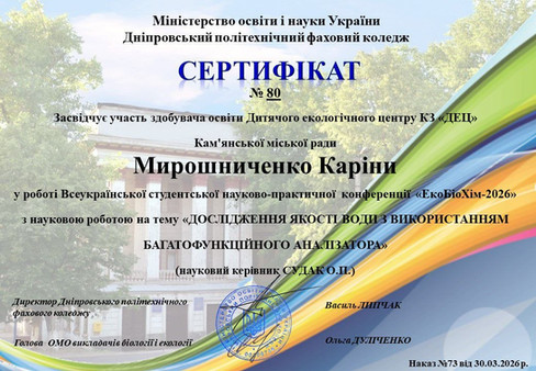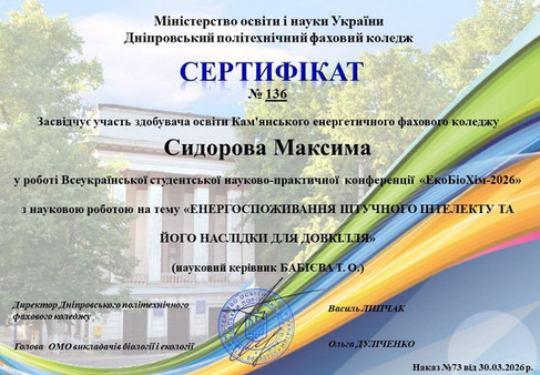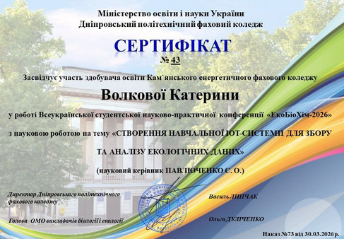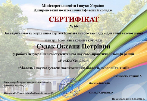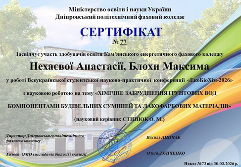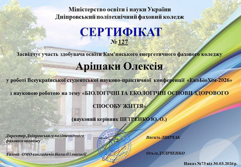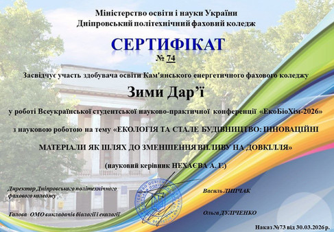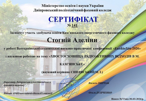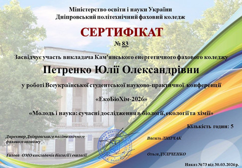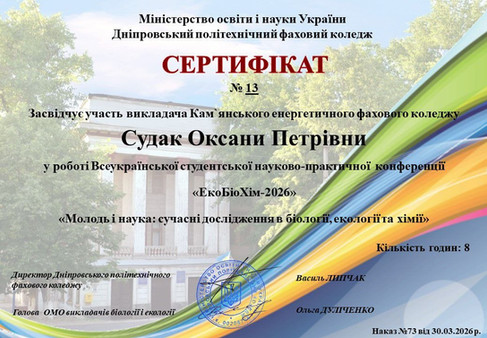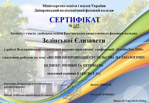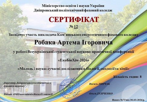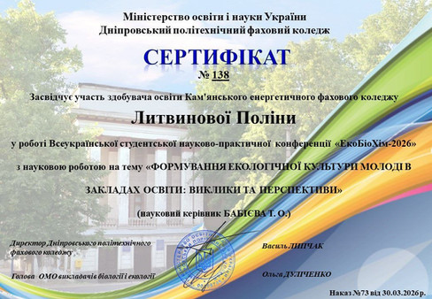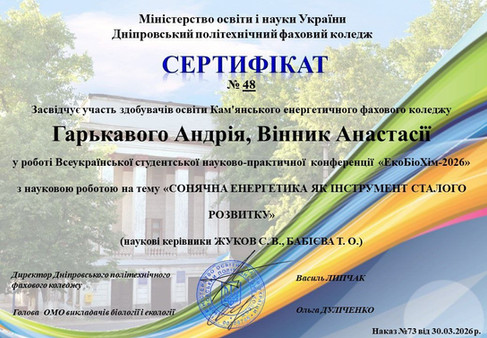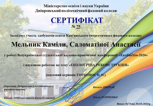25 березня 2026 року здобувачі освіти Кам’янського енергетичного фахового коледжу взяли участь у Всеукраїнській студентській науково-практичній конференції «ЕКОБІОХІМ-2026», яка об’єднала небайдужу молодь навколо актуальних проблем збереження довкілля та сталого розвитку.