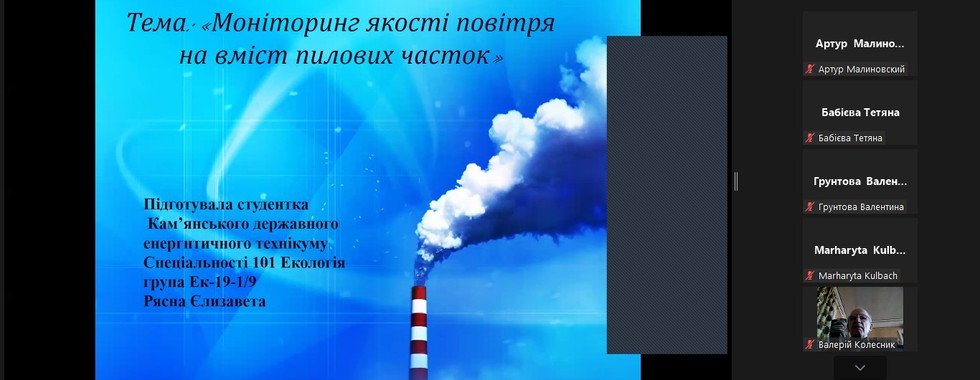 Рясна Є.С. (група ЕК-19-1/9) за темою «Моніторинг якості повітря на вміст пилових часток» (Керівник – голова циклової комісії, викладач екологічних дисциплін Судак О.П.)